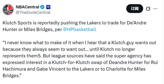 Hardwood Paroxysm寫道:“每次聽到Klutch旗下的球員想要離隊(duì),我都不知道該作何感想——他們似乎總?cè)氯轮摺芍钡終lutch不再代理他們的合約,這種聲音就消失瞭。不過據(jù)聯(lián)盟消息源透露,這傢頂級經(jīng)紀(jì)公司已表達(dá)瞭交易意向,希望促成一筆‘Klutch內(nèi)部球員互換’:要麼將德安德烈-亨特送至湖人,換取八村塁和加佈-文森特;要麼用同樣的籌碼,向夏洛特黃蜂隊(duì)交易邁爾斯-佈裡奇斯?!?/p>