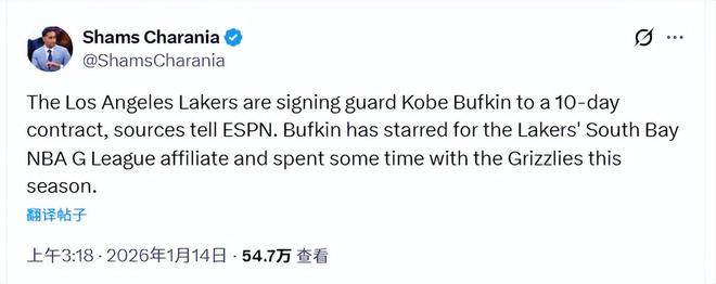 北京時間1月14日,據(jù)名記Shams報道,湖人已同意與後衛(wèi)科比-巴夫金簽下一份10天短合同。巴夫金是2023年NBA選秀的首輪15號秀,職業(yè)生涯前兩個賽季效力於老鷹,休賽期被交易至籃網(wǎng),隨後在2025-26賽季常規(guī)賽開打前被籃網(wǎng)方面裁掉。