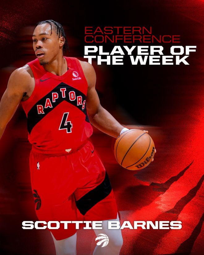 猛龍隊(duì)上周同樣打出3勝1負(fù)的表現(xiàn),巴恩斯場(chǎng)均得到22分、6.3個(gè)籃板和6.0次助攻,他出戰(zhàn)瞭其中獲勝的3場(chǎng)比賽。