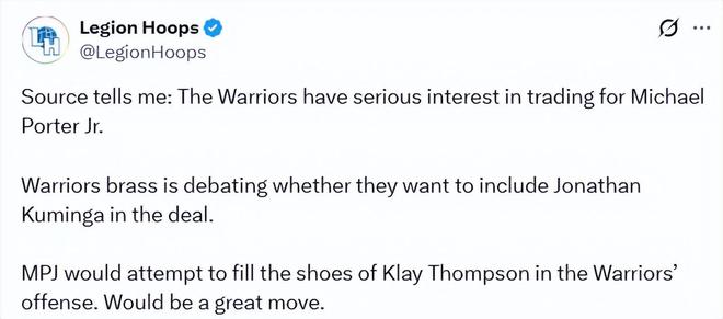 北京時間1月12日,美媒Legion Hoops報道稱,金州勇士隊對交易得到小邁克爾-波特抱有濃厚興趣。勇士管理層正就是否將庫明加納入交易籌碼展開討論。小波特將力爭填補克萊在勇士進(jìn)攻體系中的空缺。這筆交易若是達(dá)成,將會是一步妙棋。