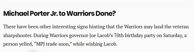 還有其他有趣的跡象暗示,勇士可能已經(jīng)接近得到小波特。在勇士老板喬-拉科佈的70歲生日派對上,有人在向拉科佈送上祝福時大喊:“很快就會有小波特的交易瞭?!?/p>