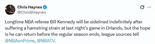 賽後,聯(lián)盟官方宣佈,肯尼迪因右腿傷勢(shì)確定退出本場(chǎng)剩餘執(zhí)裁工作。