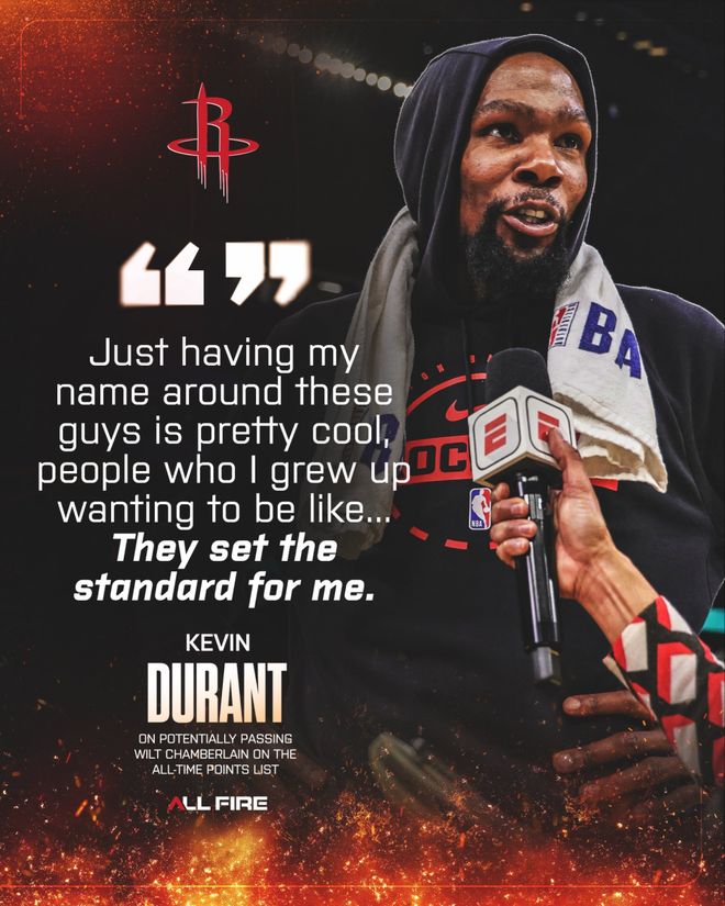 上個月,杜蘭特成為聯(lián)盟第八位生涯總得分突破31000分的球員,當時他坦言,能夠與詹姆斯、賈巴爾、卡爾-馬龍、科比、喬丹、諾維茨基和張伯倫這些名宿並肩,對他意義重大。