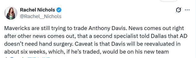NBA記者Nichols表示,獨(dú)行俠仍在嘗試交易戴維斯。就在另一位專家告知達(dá)拉斯,戴維斯的左手無需接受手術(shù)的消息傳出后不久,這一動態(tài)隨即曝光。需要注意的是,戴維斯將在約六周后接受復(fù)查 —— 如果屆時他已被交易,這次復(fù)查就將由他的新球隊來安排。