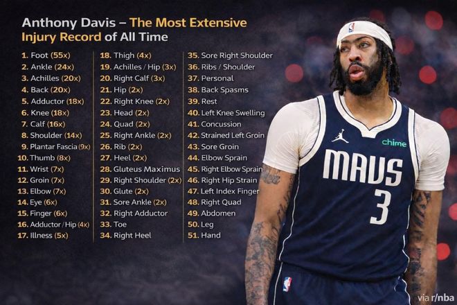 Garza表示:“戴維斯再度因左手嚴(yán)重傷勢缺陣……他職業(yè)生涯中被記錄在案的傷病已經(jīng)超過285次,這筆交易的風(fēng)險從一開始就顯而易見。簡單算筆賬就知道,14個NBA賽季里出現(xiàn)285次傷病相關(guān)情況,平均每年超過20次。他最常見的傷病部位有哪些?腳部55次,腳踝24次,跟腱20次,背部20次?!?/p>
