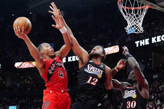 76人過去3場連贏掘金、奇才與魔術(shù)收獲3連勝,猛龍上一場客場117-125輸給凱爾特人,本賽季前兩次交鋒雙方各取一勝。本場猛龍缺少英格拉姆、巴雷特與珀?duì)柼貭枺?6人缺少恩比德與喬治。首節(jié)開局76人4-9落后,76人追到8-11落后,猛龍連得4分?jǐn)U大優(yōu)勢。76人連追4分,巴恩斯補(bǔ)籃得分,76人一波8-2攻勢反超1分,76人繼續(xù)擴(kuò)大領(lǐng)先優(yōu)勢,首節(jié)結(jié)束76人25-22領(lǐng)先猛龍。首節(jié)76人僅23中8,其中三分5中1,馬克西6中1得到5分3助攻;猛龍27中8,其中三分8中0,巴恩斯7中4得到10分。