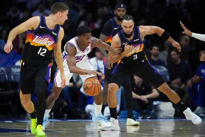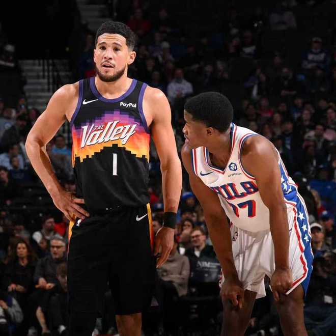 次節(jié)比賽,太陽(yáng)進(jìn)攻火力提升首次單節(jié)30分,且限制76人首次單節(jié)不足25分。太陽(yáng)被拉開29-34落后,太陽(yáng)內(nèi)外開花一波12-2攻勢(shì)反超5分,76人回敬一波7-0攻勢(shì)奪回領(lǐng)先。太陽(yáng)內(nèi)外開花重新以46-45反超比分,雙方之后持續(xù)緊咬比分纏斗至53-53,太陽(yáng)連得4分,太陽(yáng)單節(jié)30-23凈勝7分,上半場(chǎng)結(jié)束太陽(yáng)57-53反超76人。前兩節(jié)比賽,太陽(yáng)三分15中6,布克13分與伊戈達(dá)羅10分;76人三分20中6,埃奇庫(kù)姆12分與烏布雷16分。