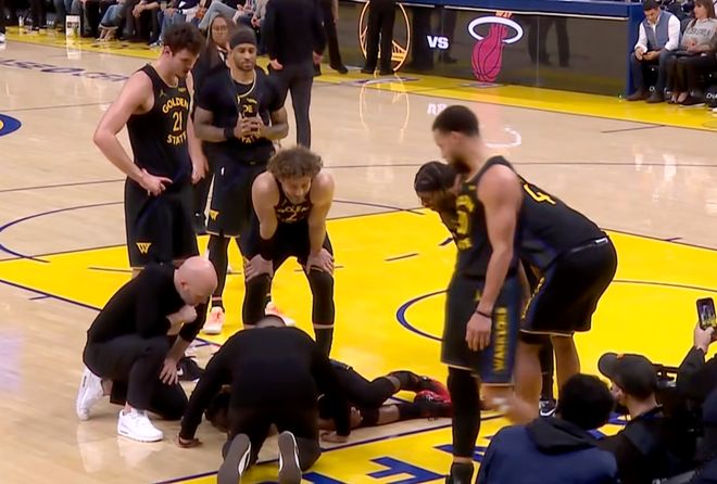 第三節(jié)還剩下7分多鐘的時(shí)候,巴特勒和小米切爾爭(zhēng)搶球權(quán)時(shí)倒地,隨后巴特勒痛苦地捂著自己的膝蓋,之后勇士立刻叫暫停,隊(duì)醫(yī)、隊(duì)友和主帥科爾都上前查看其傷勢(shì)。巴特勒在地板上躺了很久,才在隊(duì)友的攙扶下,返回更衣室接受進(jìn)一步治療。他的右腳無(wú)法承重,離場(chǎng)前,頑強(qiáng)的巴特勒擠出了令人心酸的笑容。