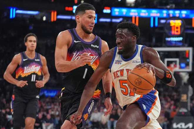 次節(jié)比賽,太陽進攻火力大幅提升比首節(jié)多得到17分,也是首次單節(jié)得分35+,尼克斯連續(xù)兩節(jié)單節(jié)不足30分。布克與阿倫接連外線得分,引領(lǐng)太陽打出一波17-4攻勢反超5分,唐斯與阿奴諾比引領(lǐng)尼克斯回敬一波18-6攻勢反超7分。雙方隨后緊咬比分纏斗,太陽單節(jié)36-29凈勝7分,上半場結(jié)束太陽追到55-56落后尼克斯。前兩節(jié)比賽,太陽三分23中9,布克13分與阿倫3記三分11分;尼克斯三分19中8,唐斯12分、阿奴諾比13+3+3與麥克布萊德10分。