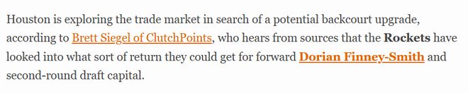 西格爾指出,聯(lián)盟內(nèi)部人士透露,火箭隊(duì)的潛在后場(chǎng)引援目標(biāo)包括新奧爾良鵜鶘隊(duì)的何塞-阿爾瓦拉多以及孟菲斯灰熊隊(duì)的小斯科蒂-皮蓬。此外,芝加哥公牛隊(duì)的科比-懷特與阿約-多森姆也在火箭的考察范圍內(nèi),不過(guò)想要得到這兩位球員,僅靠芬尼-史密斯與次輪選秀權(quán)的籌碼遠(yuǎn)遠(yuǎn)不夠。