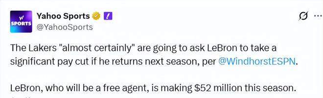 他還提出疑問:詹姆斯是否愿意像諾維茨基生涯末期效力達拉斯獨行俠那樣,為了助力球隊重建而接受降薪。詹姆斯本賽季的年薪是5200萬美元。