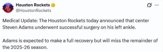 北京時(shí)間1月29日,據(jù)ESPN記者Shams報(bào)道,火箭隊(duì)中鋒史蒂文-亞當(dāng)斯因左腳踝傷勢(shì)接受手術(shù),將缺席2025-26賽季剩余全部比賽。隨后,火箭官方宣布了這一消息。亞當(dāng)斯本人曬出術(shù)后病床照:一切都很順利,感謝你們所有的關(guān)心和祈禱。