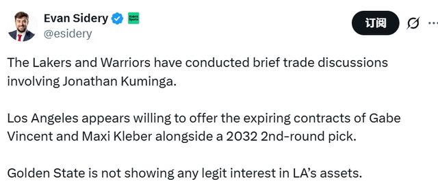 北京時(shí)間1月27日,名記Sidery報(bào)道,湖人和勇士近期圍繞庫明加展開了簡(jiǎn)短的交易談判。勇士隊(duì)已在私下明確表態(tài):對(duì)于湖人隊(duì)為庫明加開出的交易籌碼,他們并無實(shí)質(zhì)興趣。