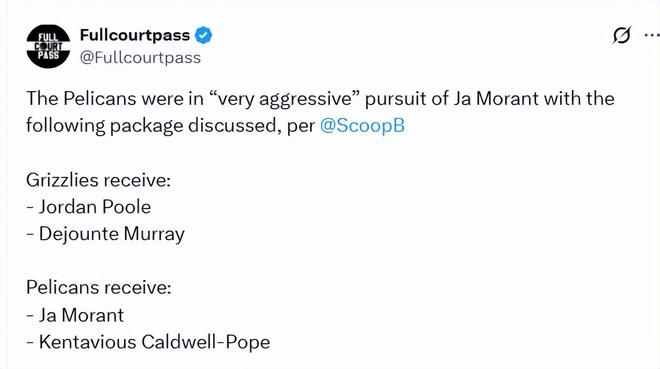 然而,鵜鶘隊(duì)卻寸步不讓。新奧爾良方面不愿為任何一套交易方案附加選秀權(quán),他們認(rèn)為送出的球員籌碼已經(jīng)足以匹配莫蘭特的身價。當(dāng)灰熊隊(duì)提出首輪簽的硬性要求時,鵜鶘目前給出了 “拒絕” 的答復(fù)。