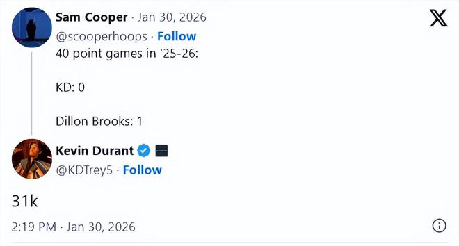 作為交易杜蘭特的籌碼之一,狄龍本賽季的表現(xiàn)非常出色,近日單場(chǎng)轟下40分,創(chuàng)生涯新高。有球迷指出,效力太陽(yáng)隊(duì)期間,狄龍的40+得分場(chǎng)次是1場(chǎng),比杜蘭特(0場(chǎng))還多,杜蘭特則回復(fù)道:“31K”,顯然是以自己生涯累計(jì)31736分的成就予以回應(yīng)。