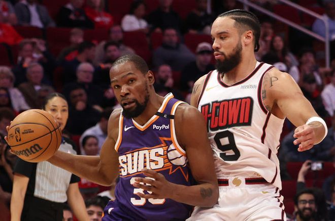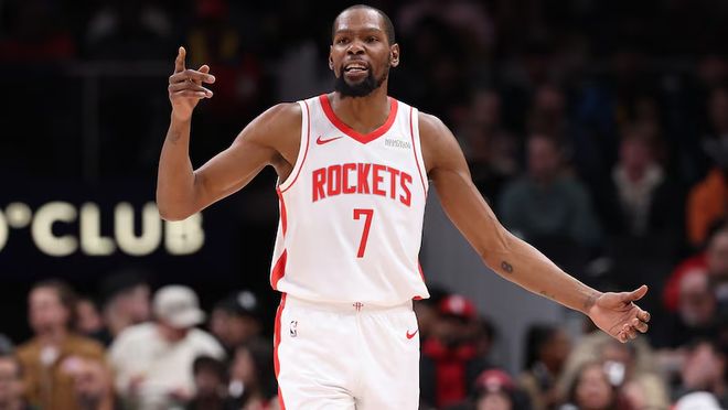 37歲的杜蘭特在加盟火箭隊(duì)的首個(gè)賽季里,依舊保持著頂級(jí)的“三級(jí)別得分手”水準(zhǔn)。他出戰(zhàn)的比賽中場(chǎng)均貢獻(xiàn)26.5分、5.4個(gè)籃板和4.5次助攻,三項(xiàng)命中率分別達(dá)到51.4%、40.8%和88.6%。