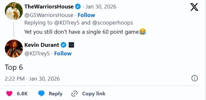 還有球迷提醒他生涯至今尚未單場(chǎng)砍下過(guò)60分,杜蘭特則留言:“Top 6”。顯然,是告訴球迷,自己近期剛躋身NBA歷史得分榜第六位。