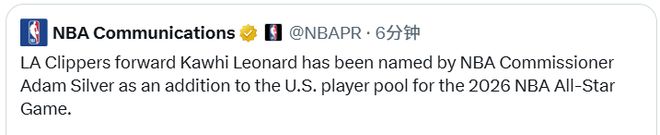 北京時間2月4日,洛杉磯快船隊前鋒科懷-萊昂納德,已由NBA總裁亞當(dāng)-蕭華宣布增補入選2026年全明星賽美國隊球員大名單。