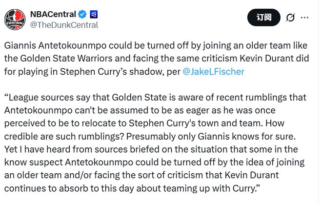 北京時(shí)間2月3日,據(jù)名記Fischer報(bào)道,字母哥可能會(huì)對(duì)加盟金州勇士這類 “老齡化” 球隊(duì)心存抵觸,同時(shí)他也擔(dān)心重蹈杜蘭特的覆轍,因在庫(kù)里麾下打球而遭受外界的非議。