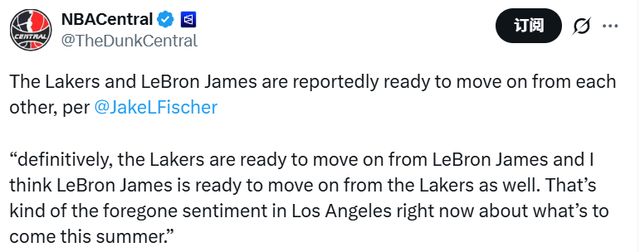 賽季至今,詹姆斯已經(jīng)為湖人出戰(zhàn)31場(chǎng)比賽,場(chǎng)均21.9分5.8籃板6.6助攻,投籃命中率50.5%,三分命中率32.9%。本賽季是詹姆斯的合同年,他的薪水是5262萬美元,賽季結(jié)束后,他將成為自由球員。雖然佩林卡曾表示希望詹姆斯在湖人退役,但目前不止一位記者爆料稱,詹姆斯和湖人的合作已經(jīng)走到盡頭。此前,名記Shams也發(fā)表過類似的報(bào)道。