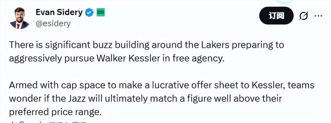 北京時間2月13日,據(jù)名記西德里報道,湖人將準備在自由球員市場上全力追求爵士中鋒沃克-凱斯勒。湖人擁有充足薪金空間,可以為凱斯勒開出一份豐厚的邀請合同。聯(lián)盟多支球隊都在猜測:爵士最終是否會匹配一份遠高于他們心理價位的合同。