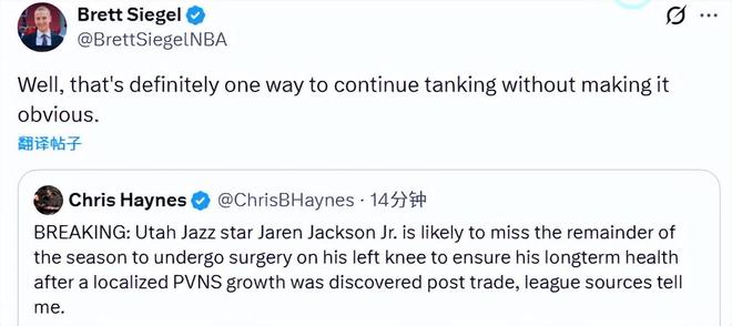名記Haynes表示,小賈倫-杰克遜可能因此賽季報銷。Siegel轉(zhuǎn)發(fā)并寫道:“行吧,這絕對是一種不那么露骨、卻能安心擺爛的辦法?!?/p>