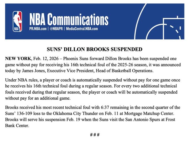 北京時間2月13日,據(jù)聯(lián)盟官方消息,太陽前鋒狄龍-布魯克斯因領到個人本賽季第16次技術犯規(guī),被處以禁賽一場、無薪處罰。狄龍將損失121,403美元的薪水。這筆錢是他21,124,110美元年薪的1/174。太陽隊將獲得50%的薪資稅差額抵免。